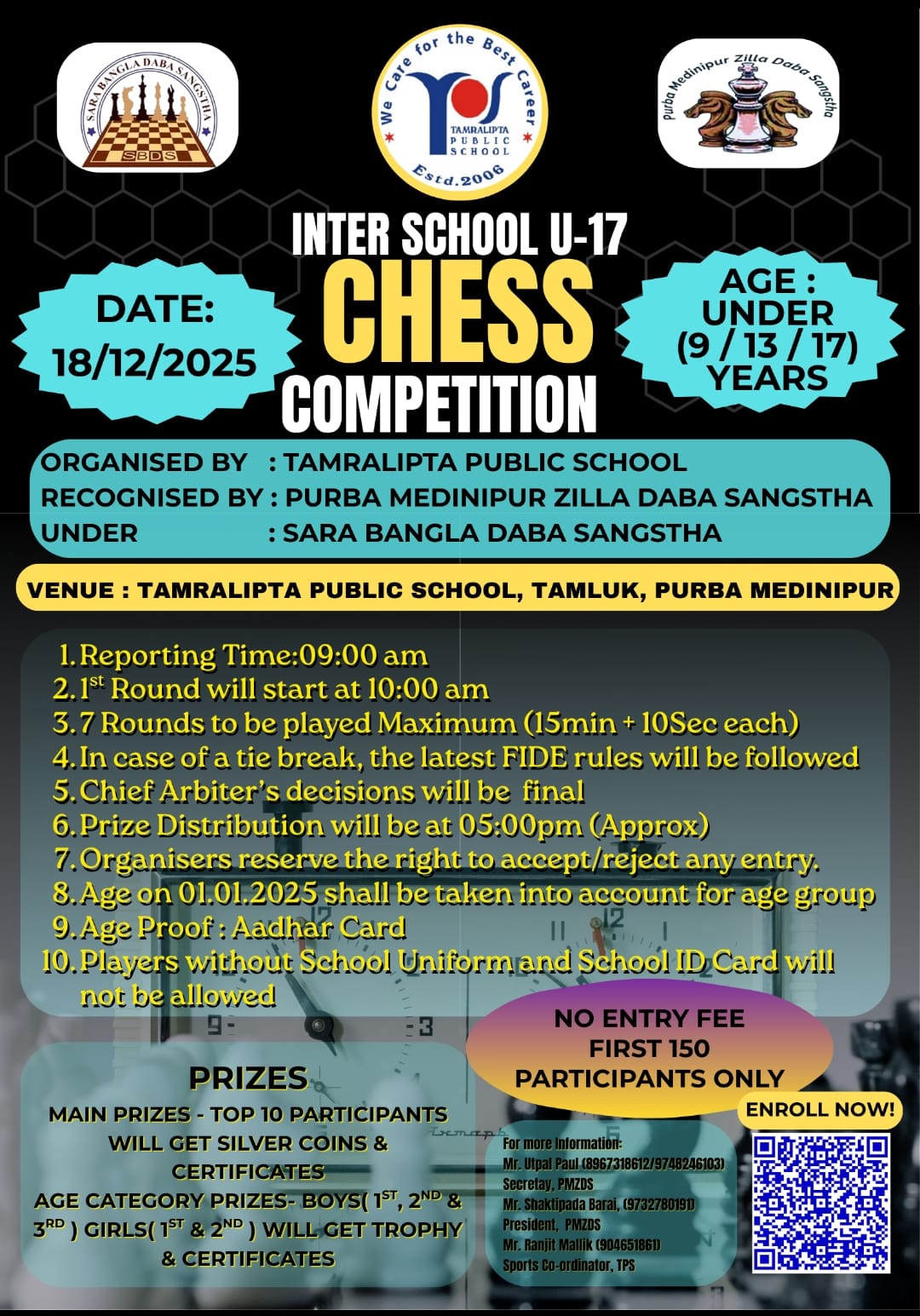 | 125 | 18/12/2025 | 18/12/2025 | Inter School Chess Tournament (U-17) at Purba Medinipore | Tamralipta Public School, Tamluk, Purba Medinipore | Download |